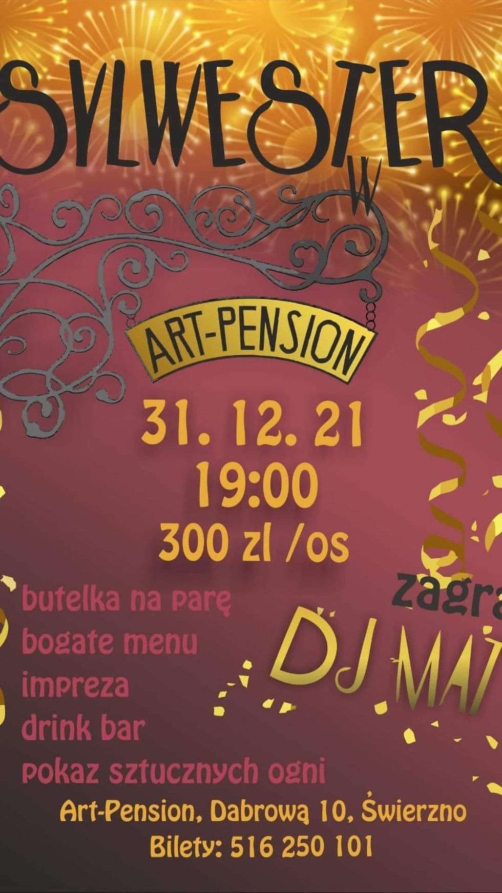 Sylwester 2021 !!!! - ART PENSIONKrzysztof GanclerzNov 14, 20211 min readUpdated: Nov 16, 2021Zapraszamy serdecznie na imprezę sylwestrową od Pensjonatu Art Pension. Jak co roku zapowiada się wspaniała zabawa przy dobrej muzyce.